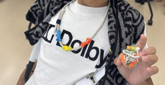 さらに今回は、漁師のダビデさん(市川淳弥さん)からいただいた漁業用のロープも活用。子どもたちはカラフルで個性豊かなマクラメを制作しました。