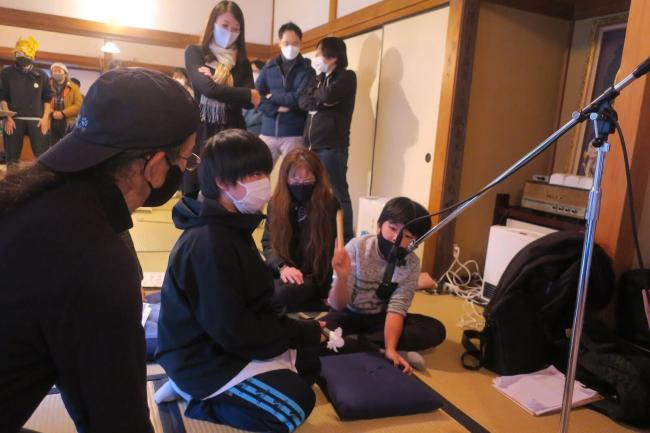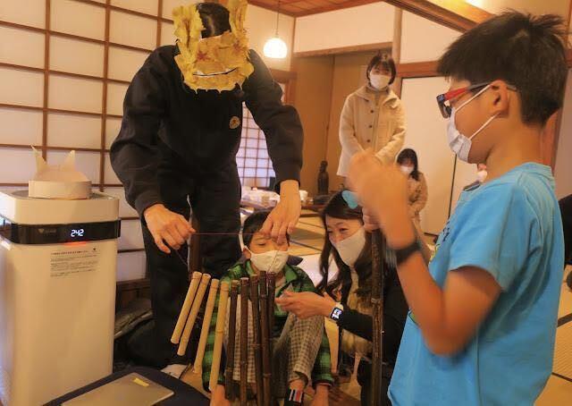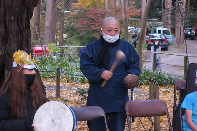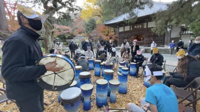 和尚さんの鐘の合図で、うたげがスタート!お面をつけた子どもたちは境内を飛び出すと、音楽のプロと唯一無二のセッションを繰り広げました。