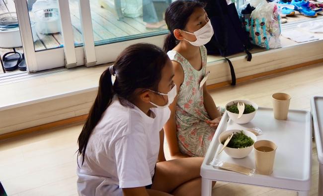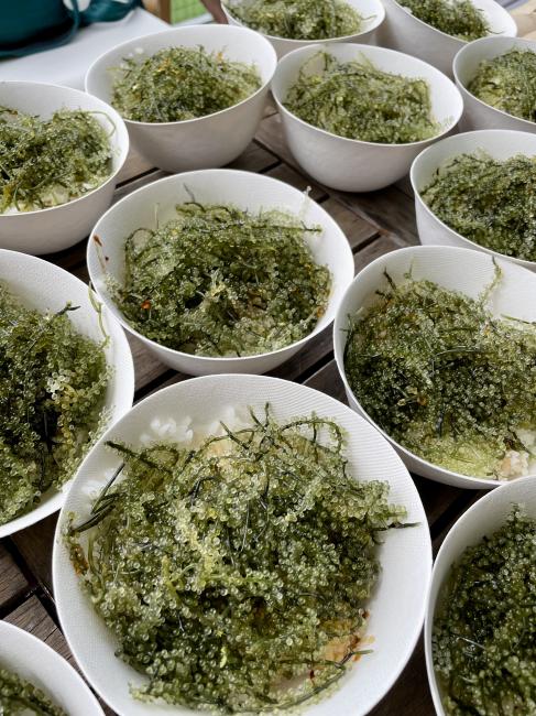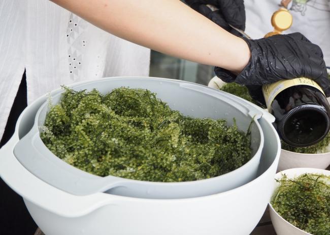 昼食では、沖縄の海ぶどうと、鎌倉の隣町の逗子で養殖されている海ぶどうの食べ比べをしました。海藻の専門家から、海ぶどうの球体の一つひとつには海水が含まれているなど、ユニークな生態について話を聞きました。シンプルにしょうゆとごま油で味つけされた海ぶどう丼を味わいながら、海ぶどうの進化の不思議に迫りました。