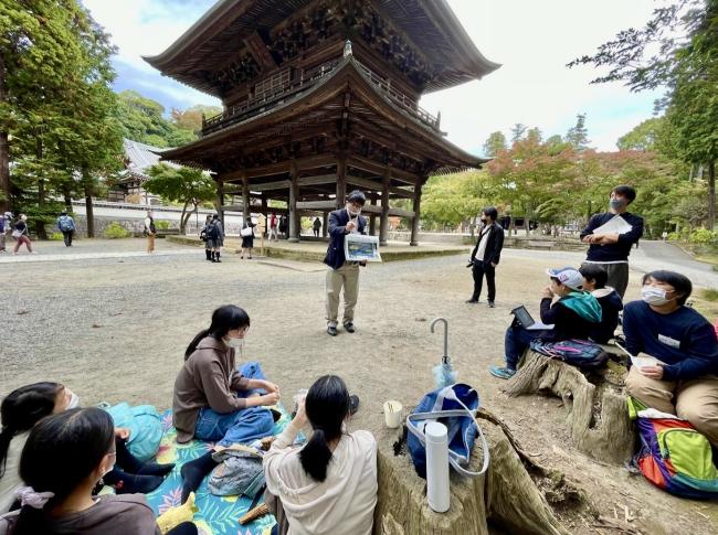 建物を見学しながら、お寺の建物が倒れず建ち続けるための仕掛けや、美しさの秘密を教えてもらいました。和尚さんと大野教授のお話に、子どもたちは興味津々。それぞれの目線で、じっくり観察していました。