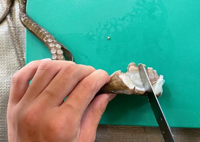 ぬめぬめ、ぐにゃぐにゃと、生きているタコを目の前にした子ども達からは驚きの声が上がります。加藤さんに教わりながらタコを捌きます。