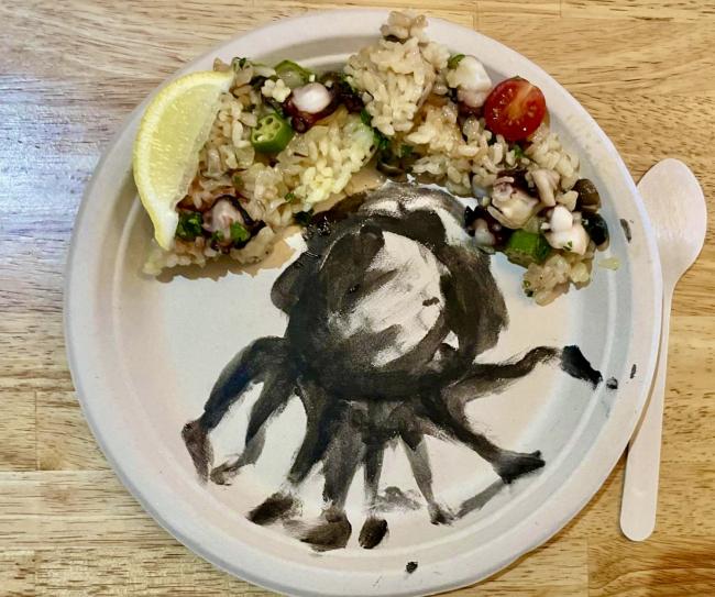 タコ墨で昼食用のプレートにオリジナルアートを描きました。