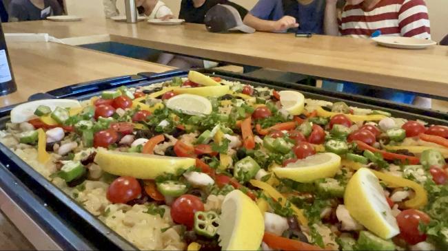 今日の昼食はタコのパエリアです。なんと、先ほどまで生きていたタコが入っています!