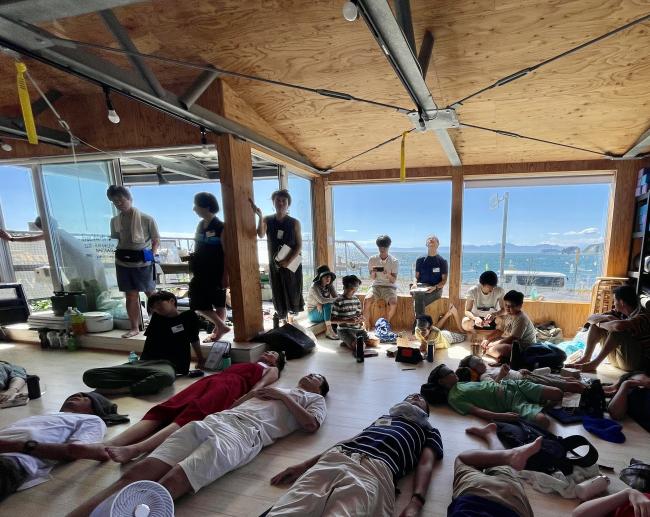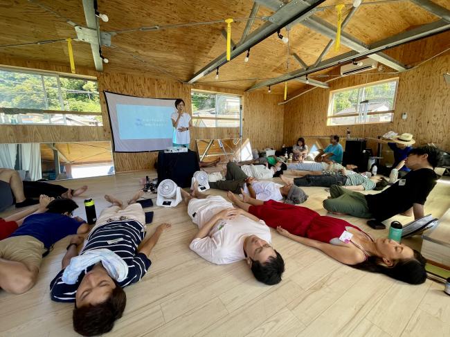 風が通る音、呼吸する音、心臓の鼓動音、、自分が感じるものだけに集中していきます。足や背中で捉える地面の感触。今、ここにいることだけに意識を向けていきます。自分だけの心地良さを見つけると、次第に眠りの世界に入る人たちもいました。