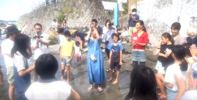 寄せては返す波のリズムに乗っては、水面を叩いて音を鳴らしたり、手に貝殻の楽器を携えて、ドンドンと足踏みで大地を鳴らします。