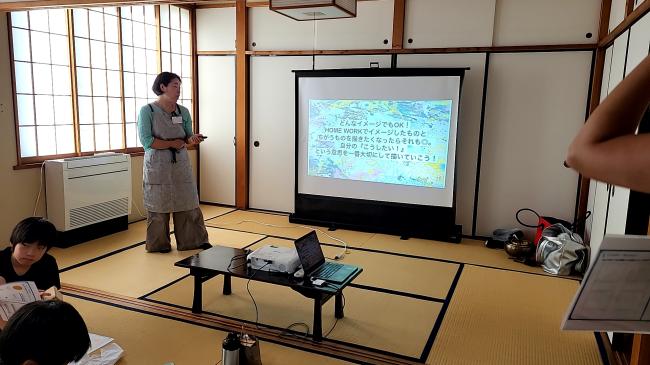 真っ白な風呂敷に、石でできた絵の具で描く意思は?動的なカヌーとは異なる、静的かつ内省的な午後の活動が始まりました。