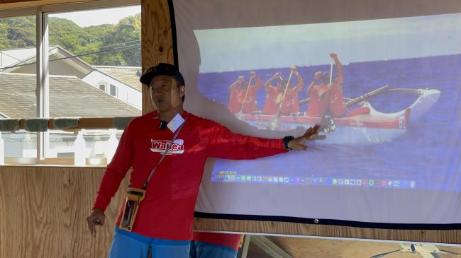二日目最初のナビゲーターは、湘南の海から来たポセイドンこと今村直樹さん。みんなにアウトリガーカヌーについて教えに来てくれました。