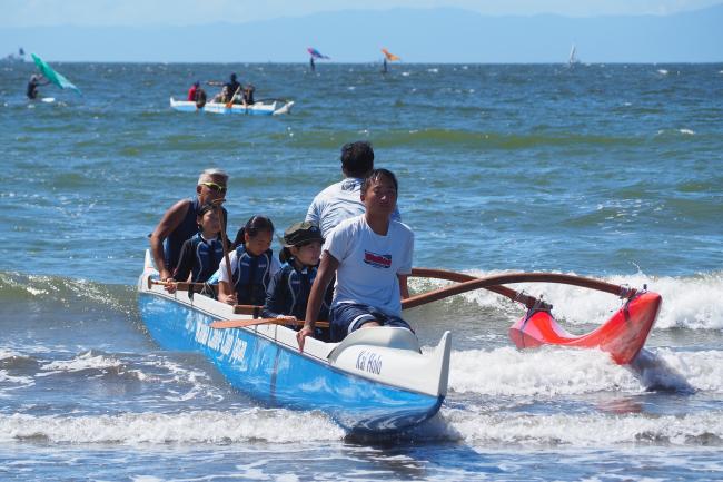 まずはパドルの使い方をエアーで練習。アウトリガーカヌーは、南太平洋の島々に生きる人々から受け継がれてきた神聖な文化。彼らは、先祖への祈りや豊作への願いといった意志を抱いて海へと漕ぎ出していたそうです。