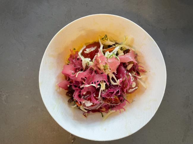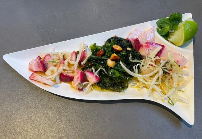 分析を終えて次なる挑戦は、Sea Vegetableの石坂シェフから「究極の海藻サラダを作れ!」という挑戦状を受けることに。石坂シェフが作っているのは、海藻とは思えない美しくて食べたことのない組み合わせの料理たち。