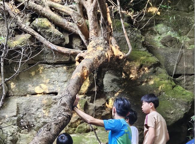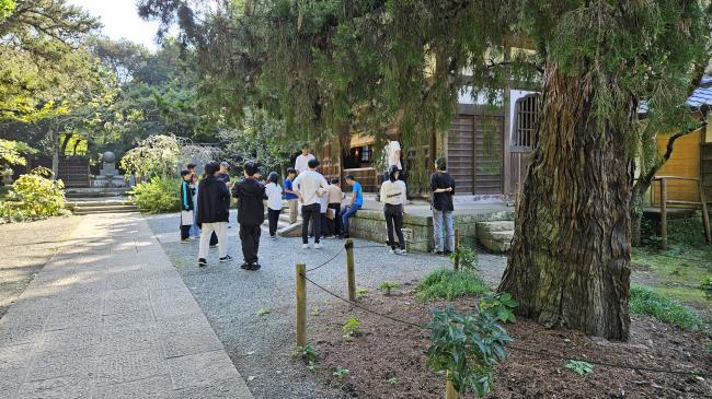 小さな顕微鏡を首から下げ、実際に鎌倉の大地を形作る石、浄智寺を支えている土台の石の観察に向かいました。足元の石ころたちに目を向けると、白っぽかったり、尖っていたり、キラキラしていたり、様々な発見がありました。子どもたちは顕微鏡で見て特徴をスケッチしたり、分類してみたりしていました。