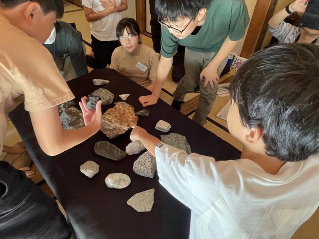 机の上には様々な鉱物や隕石が並べられました。この石の中に、約44億年前から存在する石が含まれている可能性があると聞き、興味津々の子どもたちです。