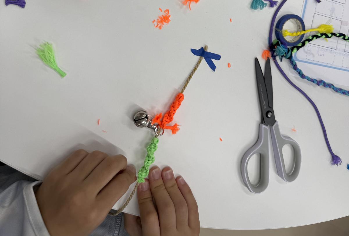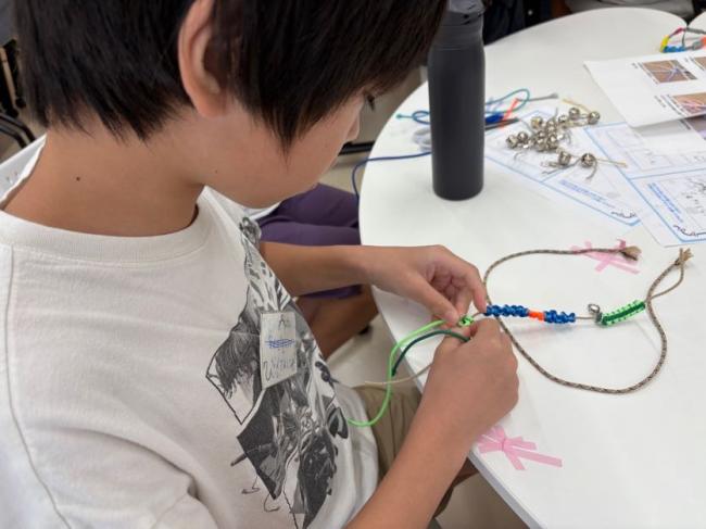 驚かされたのは、その飲み込みの早さです。講師の相良恵美さんや学生ボランティアのサポートを受けながら、子どもたちは次々と紐を編み上げ、あっという間に作品を完成させていきました。