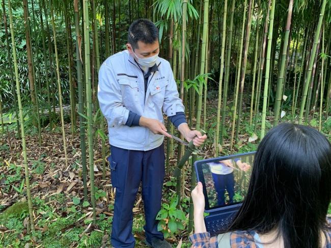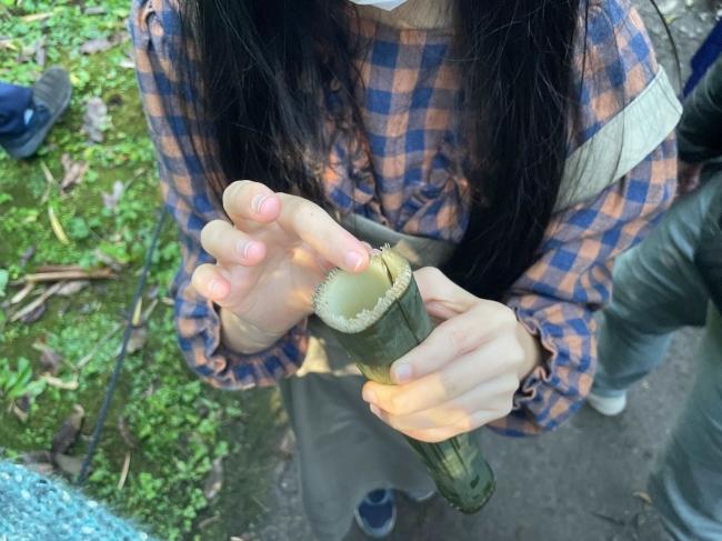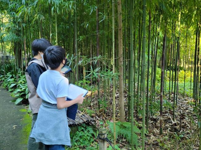 ナビゲーターの松中さんの話に耳を傾けて写真を撮ったり、タブレットを使って調べたり、中には実際に竹の断面を噛んだりしてみずみずしい竹の味を試す子どもも。各々の学び方で探究しました。