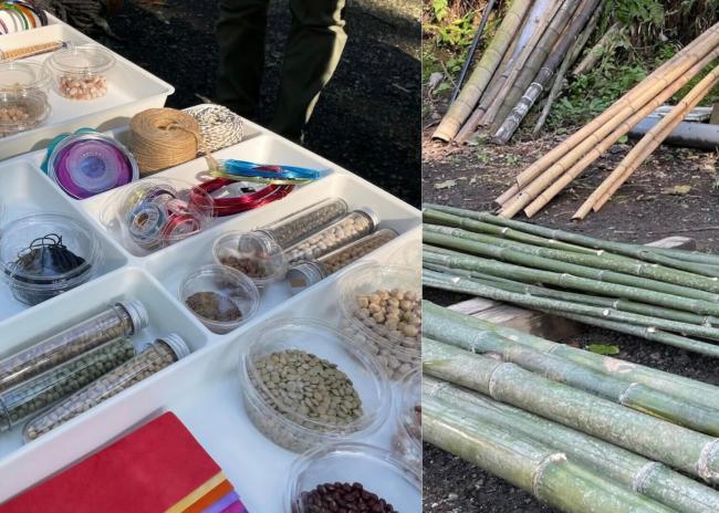 何種類もの竹をはじめ、音を鳴らしたりデコレーションするためのアイテムや道具がずらり用意されています。しかし手順や完成品の形は示されず、どんな楽器を作るかは自分次第。