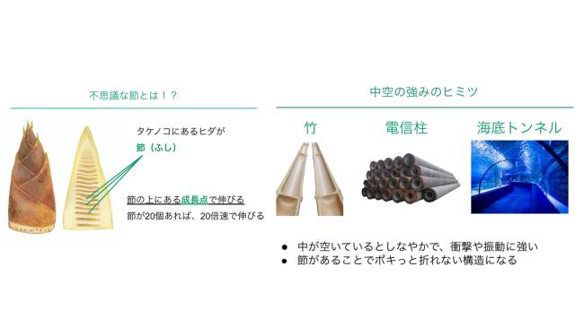 子どもたちはそれを知って驚きました。自分が生きているうちに、一度だけ見れるかもしれない?!竹と似た特徴を持つ、東京スカイツリー・うまい棒などと比べながら、「竹」の構造も深掘りしました。